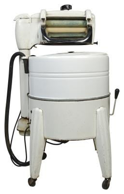 galvanizedtubsWhen the clothes were deemed to be clean they were passed through the wringer into the first rinse tub. Now, for those of you too young to remember such things, the wringer or mangle consisted of two hard rubber rollers turning in opposition to squeeze as much water as possible from the garment. A tray underneath the wringer caught the water and directed back to whence it had come, thus saving water for the next load.