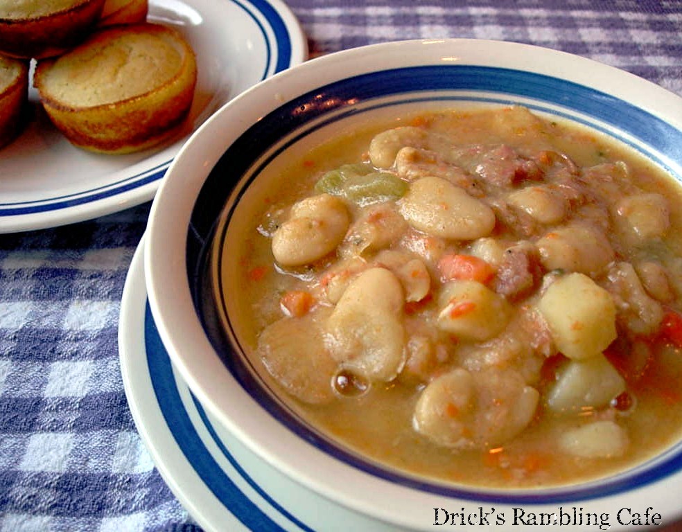 white lima bean soupAs I look back, I’m filled with admiration for Mother. If for no other reason, the fact that she prepared three meals a day for a minimum of seven people. However, it was a rare thing that we didn’t have someone “staying with us” as we used to say. This relative or that relative would come round and stay anywhere from a couple of months to a couple of years. Various siblings of both parents stayed with us several times for extended periods. Of course that meant more cooking. I’ve known Mother to make as many as 150 biscuits in a day. I imagine how difficult it was to stretch the food budget to cover twelve or fifteen mouths 21 times a week.