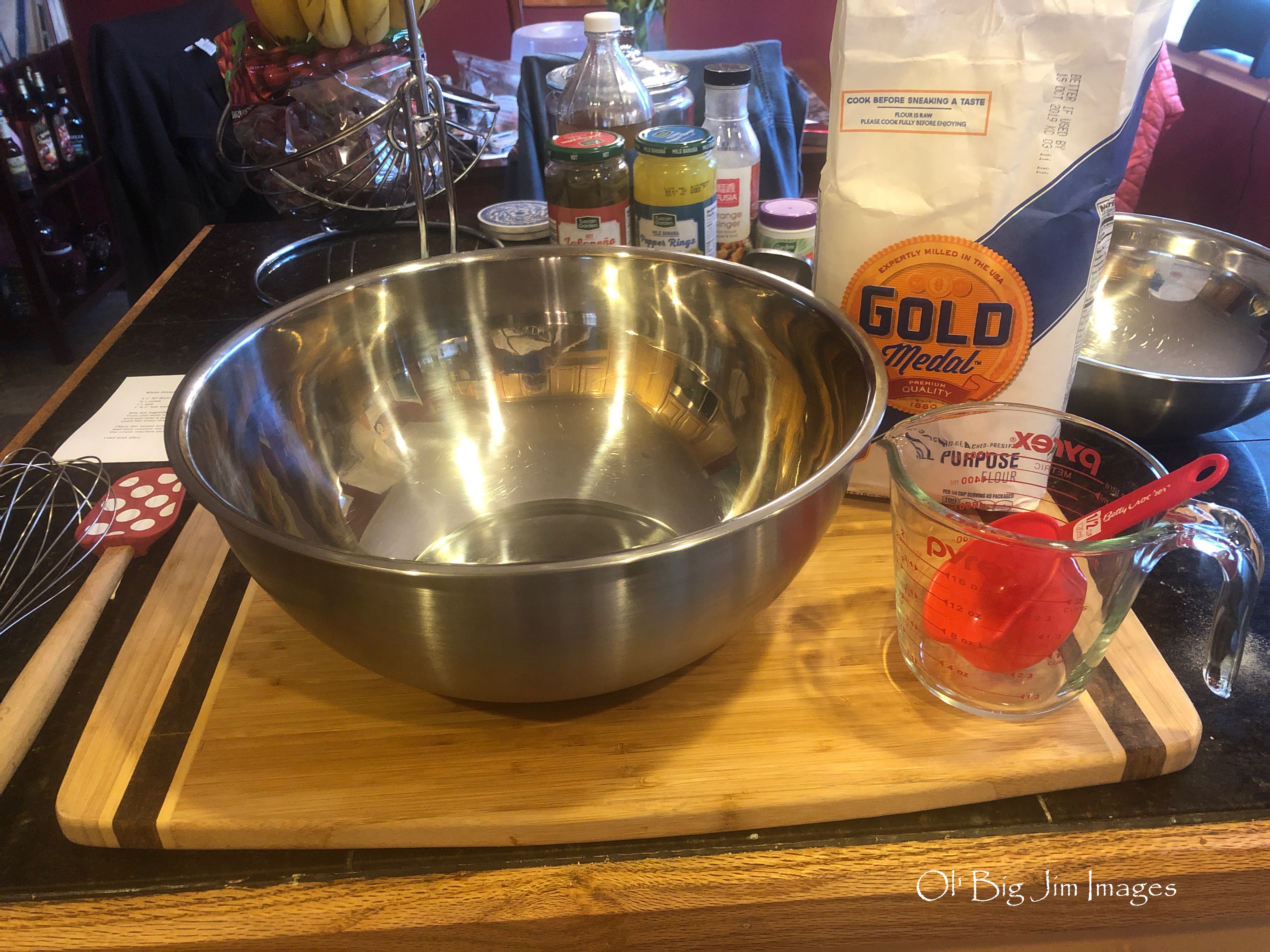 Now, I had to turn my attention to getting ready to cook! I got down our lovely red Dutch oven and put it into the oven and set the gas to 450°F (232 °C)and waited for it to reach temperature.