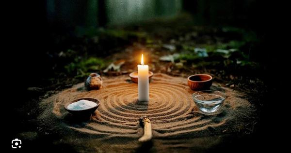 The beam caught the circle. The candles. The objects half-swallowed by earth.